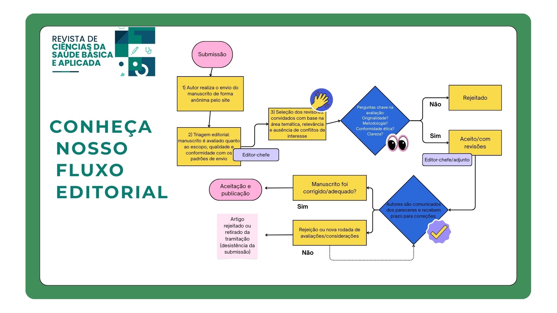 3 - Após aprovação quanto à prioridade científica e à adequação às “Diretrizes para autores”, os manuscritos serão encaminhados para revisão quanto ao mérito científico para dois avaliadores “ad hoc”, selecionados pelos editores, de reconhecida competência nas áreas temáticas de ciências da saúde. Caso haja discordância entre os pareceres será convocado um terceiro revisor. Esse processo de avaliação é por pares do tipo Blind review, ou seja, é um procedimento sigiloso quanto à identidade tanto dos autores quanto dos revisores.